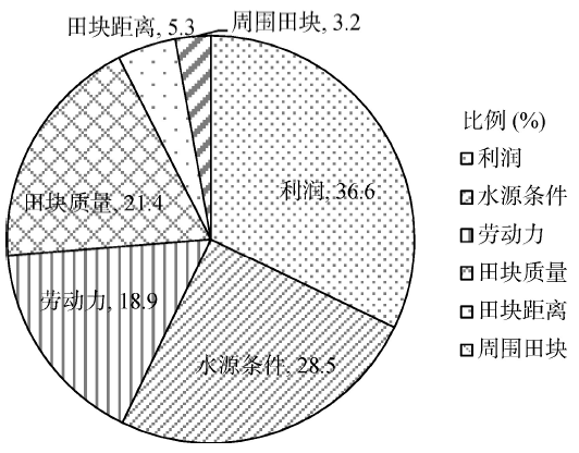通过对调查问卷分析可知,主产区农户水稻熟制变化的主要原因是利润、水源条件、田块质量(图2),另外劳动力和农田基础设施对水稻熟制也产生了一定影响。36.6%的受访农户其水稻熟制受利润影响较大,28.5%的农户受水源条件的影响而做出熟制决策,水源条件较好倾向选择双季稻,水源条件较差则种植单季稻或一季早(晚)稻。通过实地调研发现,该区农户大多倾向种植双季稻,但因田块质量、水源条件等原因而选择单季稻或双季稻其中的一季。