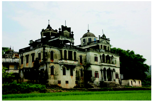 可以发现,比较的背后是对原本联通的“五邑”文化空间的割裂。以台山与开平之间的关系为例,老一辈移民对开平与台山等地的地域区隔感相对较弱。一位七十余岁的村民表示:“到外面都是家乡人,都讲家乡话。他们那里姓雷的和我们这里姓方的其实就是一家啊。(Z18)”雷、方、邝三姓一族,族人主要分布在开平与台山两地,而总堂设在两地相接的水口镇。随着侨乡形象逐渐模糊,年轻人对于“五邑”在地域与文化上的整体性已缺乏感知。如一些年轻受访者就表示:“台山那边真不了解,之前公司组团去两日游过。我只知道广海那里海鲜不错。别的都那样吧。(Z37)”“开平碉楼与村落”中狭窄的地域界定更加重了这一情况。各地区之所以彼此比较,是因为申遗策略的不周,引发认同上的划界,使得碉楼成为博弈的资本,而并非认同的连接点。“开平碉楼与村落”申遗成功,认可的是五邑所共享的华侨历史与文化。“五邑”作为一个文化区,拥有共有的文化景观,台山“洋楼(图4)”与碉楼有相近的渊源与属性[28]。但目前的情况是,人们忽略背后的共通性,而只认可“世界文化遗产”名义上框定的范围,连碉楼公司的工作人员都说:“碉楼只是开平的金招牌!台山无论有几多碉楼或洋楼都没用。(Z09)”