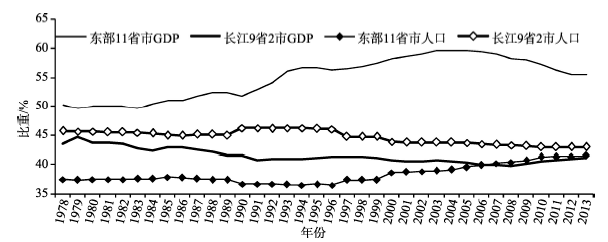 图1 1978年以来东部沿海地带和长江经济带GDP和人口占全国31个省市区比重的变化