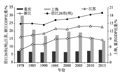 图2 1978年以来长江经济带沿海3省和沿江26市(州)、重庆市GDP占比的变化