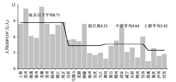 图3 2012年长江干流沿线市州的人均GDP阶梯状格局