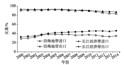 图5 2000年以来长江经济带和沿海地带外贸进口额和出口额占全国比重的变化
