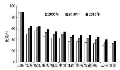 图7 长江经济带各省市城镇人口比重