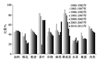 图8 1980年以来长江经济带主要大宗农产品占全国比重的变化