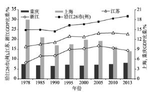 ... 改革开放以来,长江经济带空间结构极化态势显著,极化区域主要是长江三角洲和干流沿岸主要城市(段学军等, 2009 ).图2 显示,1978年以来,长江经济带沿海和沿江地区的GDP占比中,除上海市表现为下降趋势外,其余均显著上升;其中,沿海地区的江苏、浙江两省GDP占经济带的比重上升最为明显,其次是沿长江干流的26个市(州)① (①以拥有长江干流岸线为准统计,包括25个市:南京、无锡、常州、苏州、南通、扬州、镇江、泰州、合肥、芜湖、马鞍山、铜陵、安庆、池州、九江、武汉、黄石、宜昌、鄂州、黄冈、咸宁、荆州、岳阳、泸州、宜宾;1个自治州:恩施.)GDP占经济带的比重从1978年的1/4上升为2013年的1/3. ...
