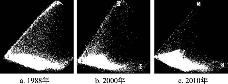 图2 1988、2000和2010年主分量散点图(1-裸土;2-裸岩;3-植被) |