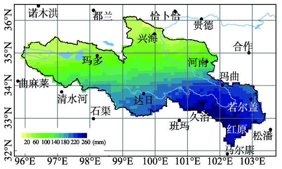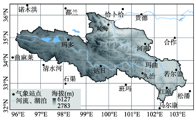 研究区为黄河源区,具体为唐乃亥水文站以上流域,总面积达12.2万km2,1956-2010年唐乃亥水文站平均径流量达198.8亿m3,占整个黄河入海口同期径流量的42%[16]。研究区涉及玉树、果洛、海南、黄南、甘南、甘孜和阿坝7个自治州的16个县(图1),海拔大多在3000 m以上。