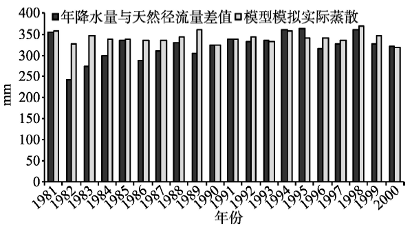基于改进的LPJ模型模拟的1981-2000年黄河源区年实际蒸散为342.28±12.33 mm,与唐乃亥水文站控制流域年降水量和实测天然径流量的差值(323.07±30.33 mm)相比(图2),表明改进模型模拟实际蒸散的结果较合理。