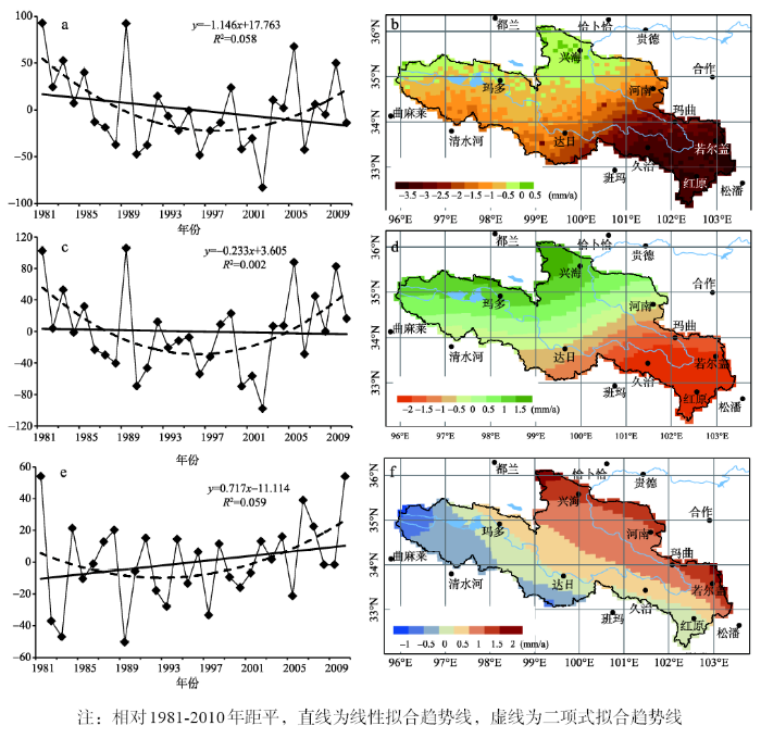Fig. 5 Changes in the anomalies of water conservation (a, b), precipitation (c, d) and potential evapotranspiration (e, f) in the Source Region of the Yellow River during 1981-2010 (solid straight line denotes linear fitting trend, and dashed line denotes binomial fitting trend)