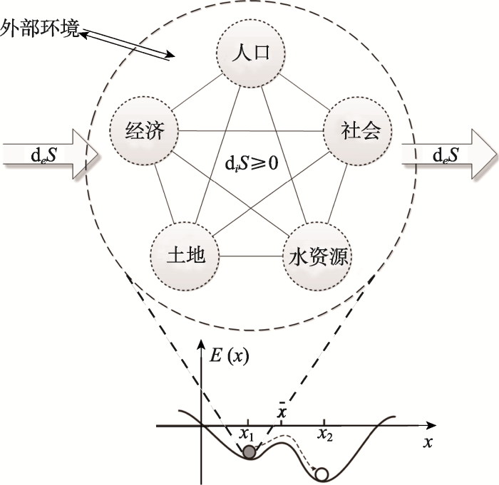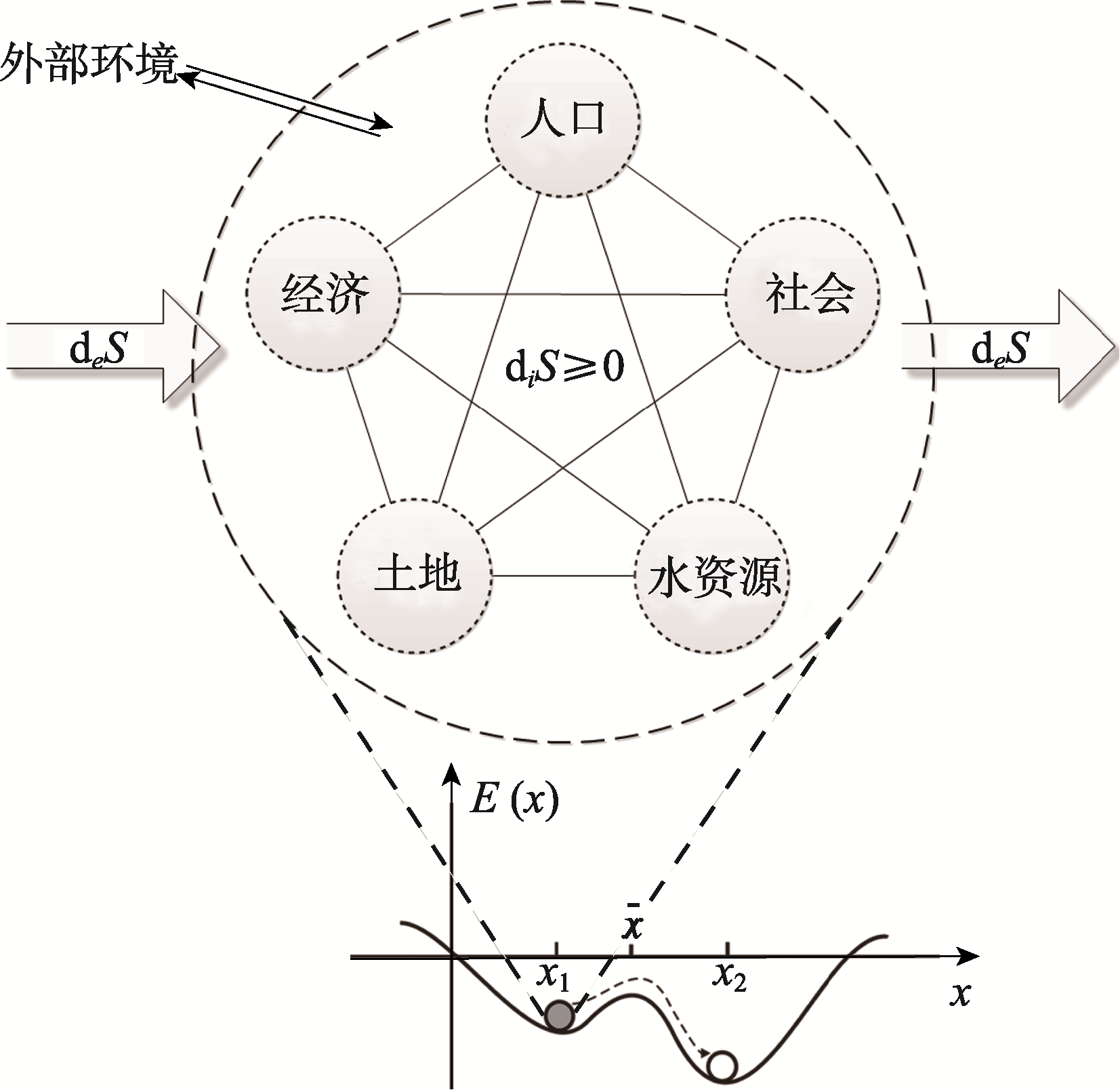 借助协同学与耗散结构理论,本文将这种协同维生关系进行定量化表达。如图3所示,x轴表示整个系统不断涨落的过程;diS表示绿洲城镇化系统内部混乱性产生的熵;deS表示系统与外部环境相互作用产生熵流;dS表示总熵。当系统获得的正熵大于负熵时,总熵变dS>0,各子系统承载力减弱,系统整体趋于混乱:反之,系统整体趋于有序[36]。协同学认为,在绿洲城镇化系统演化过程中只有少部分慢变化参量(序参量)决定了系统的宏观行为,因此本文重点关注序参量的变化[37],例如水资源总量、产业结构、交通便捷性等便是在绿洲城镇化系统中起支配作用的序参量。综合运用协同维生的序参量判据和熵判据,构建社会、经济、人口、土地、水资源等子系统的协同度和绿洲城镇系统有序度来间接反映系统的竞争与协同规律,进而模拟各个子系统和绿洲城镇系统整体的演化协同有序性,判别系统的整体演化方向。