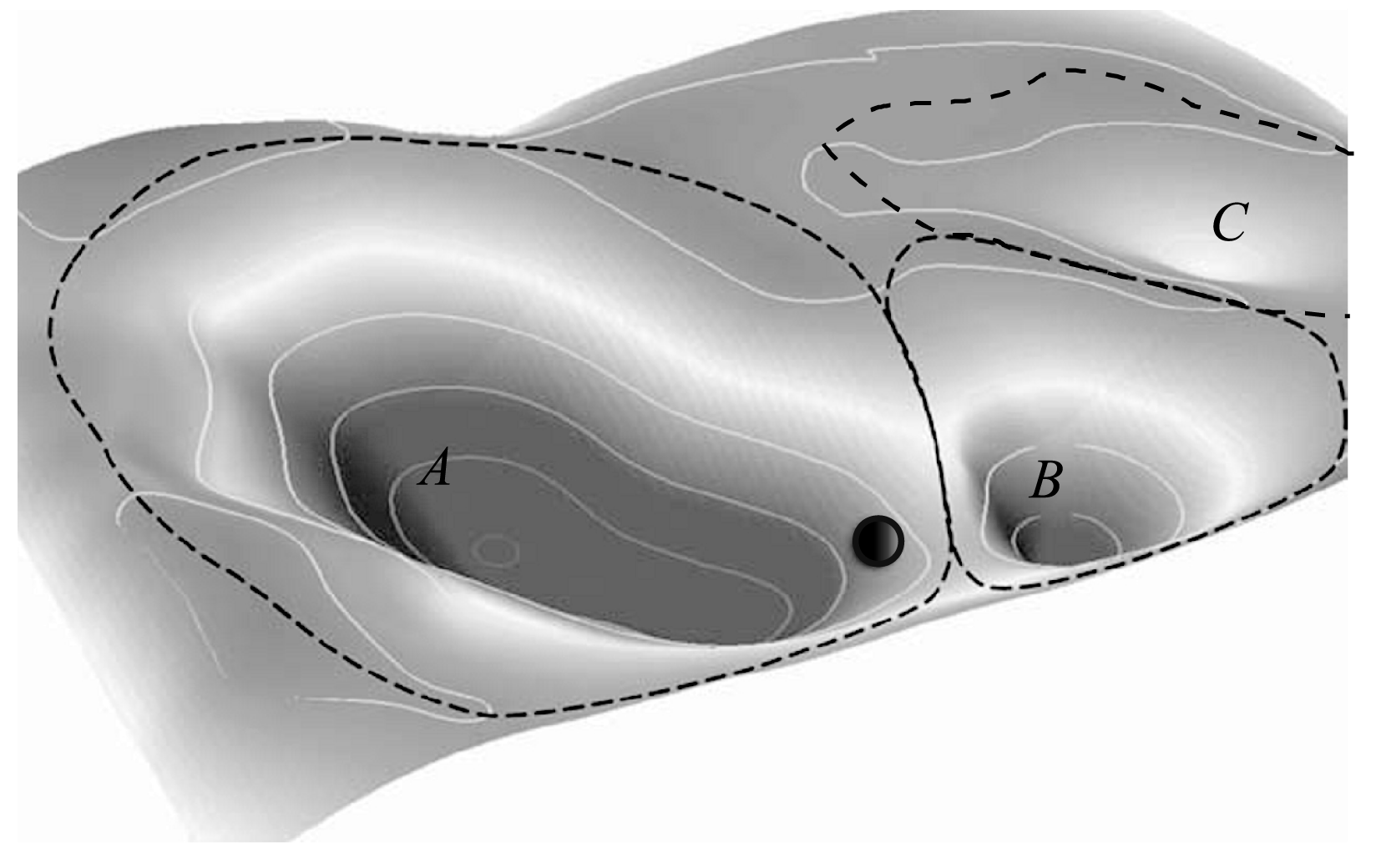 如图5所示,假设绿洲城镇化系统是由许多三维空间的盆体(A,B,C,…,N)组成,盆体的形态是动态变化的(环境策略),那么盆中小球则代表了由绿洲城镇化系统现有的所有变量集合而成的特别联合体,小球的位置即系统目前所处的状态。因此,系统的状态空间可以通过关注的变量来定义,它包含了盆体所有位置(系统所有状态)的排列组合。因此可以看出盆体仅是小球在三维空间坐标点的无限聚合,一个盆体代表了一组具有相同功能与反馈的状态。虚线表示将不同盆体分开的临界阈值。