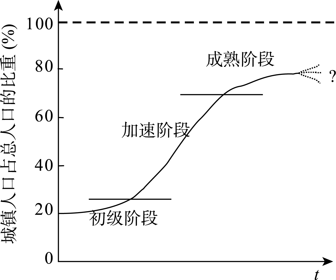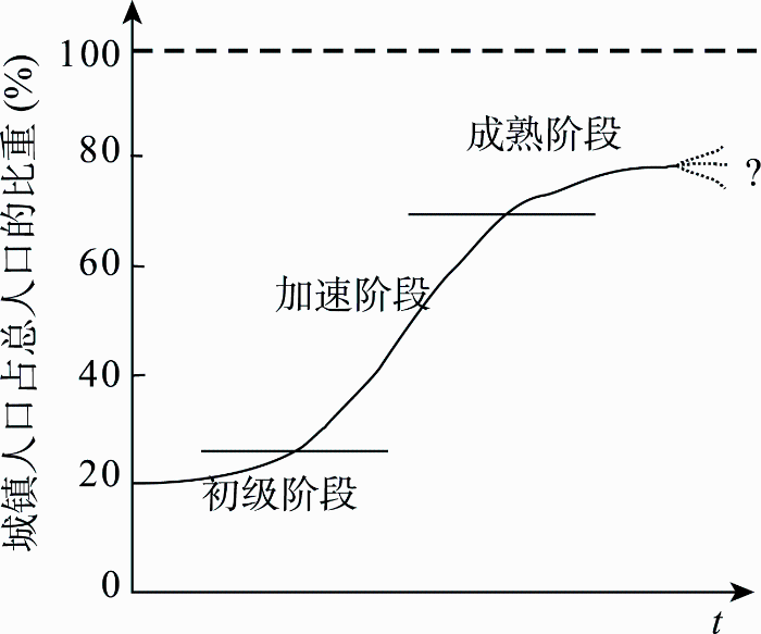 美国地理学家诺瑟姆(Northam)于20世纪70年代提出各国城市化过程的轨迹为S型曲线的理论,并将城市化过程大致分为三个阶段:初级阶段、加速阶段和成熟阶段(图6)[48]。城市化曲线是否存在第四阶段甚至第五阶段,不同学者仍存在争议[49-51]。但总体来说,不同区域、不同历史发展阶段和不同政治体制下城市化进程都不尽相同,因此城市化曲线的具体型态和走势也有很大差异。本文以诺瑟姆最初提出的城市化曲线为基础进行分析。