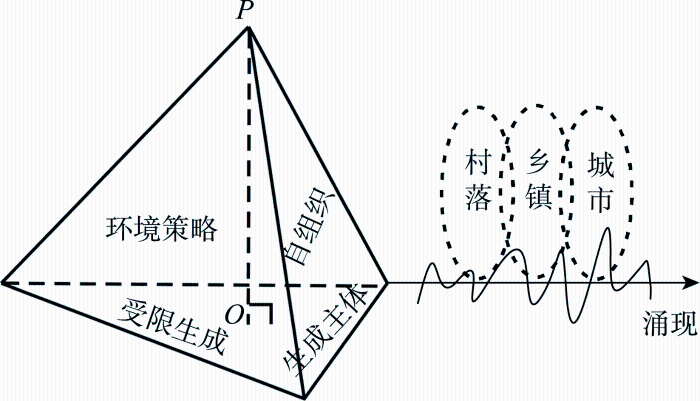 基于以上分析,绿洲城镇化的推进和转型急需正确的理论指导与路径探索。本文运用复杂性理论的研究视角和方法剖析绿洲城镇化演进机理,通过引入涌现、协同、“吸引盆”等概念和模型,从涌现生成、协同维生、临界相变三个维度构建绿洲城镇化复杂演化的理论框架。对绿洲城镇化的发端、演进和转型的过程与机理进行系统分析,并据此对诺瑟姆曲线进行重新解读。从而形成一套基于绿洲城镇化复杂性和复杂性科学的绿洲城镇化机理解释框架,以期对西北干旱区新型城镇化的规划与建设提供理论支撑。