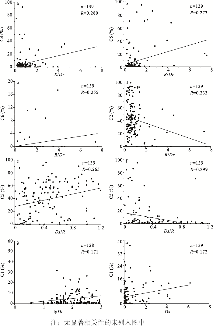 其次,散点图相关分析和RDA分析结果表明,影响湖泊沉积物粒度组分空间分布的另一因素为样点的相对位置(Ds/R),其中C3组分与Ds/R呈极显著正相关关系(n=139,R=0.265,P<0.01),C5组分与Ds/R呈极显著负相关关系(n=139,R=0.299,P<0.01);RDA分析表明Ds/R(F=4.96,P=0.0120)是仅次于R/Dr的影响因素,指向轴1负向和轴2的正向,与R/Dr正交,与C3组分夹角小于15°,与C5呈反向关系,表明远离湖岸的近湖心地带样品中悬移中粗粉砂(C3)含量较高,而近岸湖滨带样品中跃移中粗砂(C5)含量较高,可能反映湖岸水力侵蚀碎屑沉积和波浪作用造成的二次悬移再沉积过程是造成上述分异的主要因素,一方面波浪水力侵蚀湖岸产生粉砂和砂就地或随拍岸浪湖水往复流近距离沉积,另一方面波浪作用造成水动力基带(1/2波长)内的早期沉积细粒物质二次悬移,随湖水流迁移至水动力较弱处(如近湖心地带)再沉积。此外,散点图结果显示细粒粘土组分(C1)与水深(De)呈显著正相关关系,可能水深较大处多处于波浪作用下界,表层沉积物较少受到二次悬移迁移作用,相反却能接受别处碎屑物的二次悬移细粒组分,造成细粒粘土组分(C1)含量较高。需要说明的是,RDA分析并不支持水深和C1组分的关系,可能不同的统计分析方法敏感度不同。散点图结果分析中Ds/R与细粉砂(C2)组分呈不相关关系,表明C2组分并非河流搬运或湖岸侵蚀而来,可能主要源自于风力悬移传播。