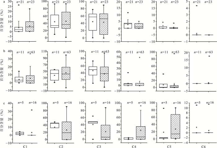 此外,为深入探讨入湖河流对湖泊沉积物粒度空间分布特征的影响,本文运用统计学箱线图法对比分析了有、无入湖河流两类湖泊不同区域表层沉积物粒度各组分含量变化特征,其中入湖河流包括常年性河流和季节性河流,不含短暂性坡面流水河流。箱线图利用Origin 8.0软件完成。
