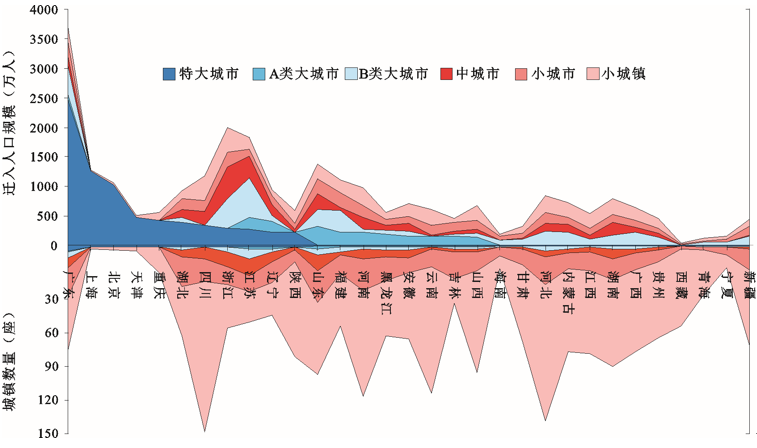 从流动人口的迁入目的地来看,具有显著的大城市指向(图1)。根据中国新近颁布的《新型城镇化》规划中的城镇分类标准,可将城镇分为500万以上特大城市、300~500万大城市、100~300万大城市、50~100万中城市、50万以下小城市和县城。图2所示,展示了分省各类城镇数量及其流入人口规模示意图。中国特大城市分别是广东省的广州市、深圳市、佛山市和东莞市,北京、上海、天津和重庆4个直辖城市,以及武汉、南京、杭州、沈阳、成都和西安,共14座,数量极少,但迁入人口规模占本省份额极大。300~500万大城市(A类大城市)和100~300万大城市(B类大城市)分别有12座和55座,主要集中在东部沿海,且有部分中西部省会城市入围。与特大城市相似,也存在城市数量少、流动人口过度集中的问题。中等城市虽有135座,但流动人口吸纳规模有限。数量众多的小城市(417座)和县城(1 633座)的流动人口集聚能力显著不足。