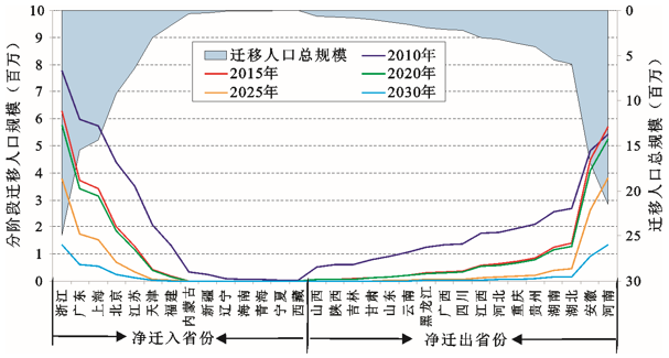 图2 中国省际流动人口的空间迁移总量预测(2010~2030年)