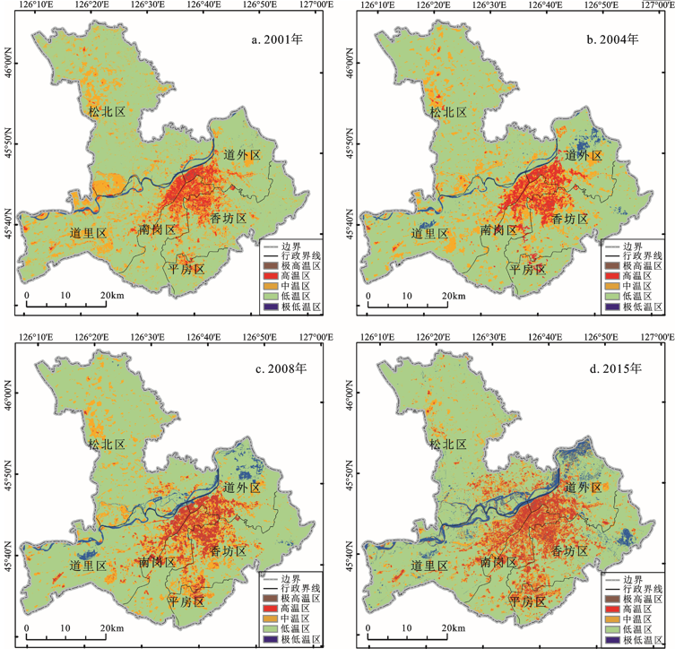 到2015年极低温区增加87.71 km2,占比增幅4.41%,3时段具有不断上升趋势,这源于松花江流域哈尔滨段经过一系列水利工程使得河道面积大幅拓宽,其附近的支流、湖、泡、湿地沼泽区域增多(道外区北部更为明显),加之道里区中部“立功水库”的修建和香坊区东南部林地种植。低温区减少84.94 km2,降幅4.12%,源于耕地资源用途非农化。中温区减少110.61 km2,降幅5.33%,源于松北区中北与西南部,道里区中部低植被覆盖地区开垦为耕地,植被覆盖增加,地表温度降低,进入低温区。高温区增加104.07 km2,增幅5.00%,3时段具有持续增加特征,分布范围由城区向外部扩张,源于城市化快速发展导致硬化路面与钢筋混凝土建筑物密度增多,温度提升,同时松花江西侧沿河两岸裸土高温范围由于河道拓宽和植被覆盖增多导致面积减少。极高温区增加4.92 km2,增幅0.24%,在城区中北和中南部居多,源于集中连片的道路、广场等所形成的高度聚温显热效应。
