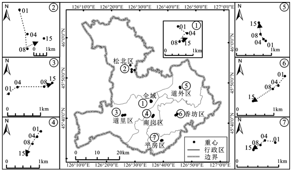 城市规模和工业用地的不断扩张,加之人口的快速增长,导致基础设施成摊大饼式发展,使得城区向外缘扩展幅度较大。总体呈现出南拓至平房区中部,北越过松花江流域,西展至道外区中部,东推至道里区中东部的格局,城区内部旧城区不断改造、新建筑群不断兴起,地表温度随建设用地扩张不断上升,重心不断变化(图3)。其中,2001~2004年以建设道外区和香坊区为主,重心向东南方向移动,2005~2008年以城区南拓至平房区为主,重心向西南方向移动,2009~2015年以完善平房区、新建松北区、改造旧城区为主,重心向东北方向移动。因此,地表温度重心向东偏南70.58°方向移动536.90 m,表明地表能量的空间变化趋势向东南迁移。