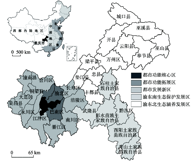 重庆位于中国内陆西南部、长江上游地区,面积为8.24万 km2,与湖北、湖南、四川、陕西和贵州五省毗邻。目前重庆下辖38个行政区县(自治县),其中有23个区、15个县(4个自治县),是中国目前行政辖区最大、人口最多、管理行政单元最多的特大型城市(图1),从人口和面积上来说不逊于一些省区,因此本文将其视为省级行政单元。自1997年重庆成直辖市以后,重庆市紧紧抓住中央直辖、西部大开发、三峡工程建设三大历史性机遇,实施城乡统筹战略,调整经济结构,推进区域经济发展,宏观经济得到了快速发展,但与此同时经济发展逐渐形成鲜明的地域特色及空间分异。2006年市政府依据重庆市地理条件及各地区经济发展水平提出了“一圈(即主城九区)两翼(渝东南+渝东北)”的构想,2013年,在此基础上将“一圈”细化为都市功能核心区、都市功能拓展区、城市发展新区以进一步明确各区县的功能定位(图1)。