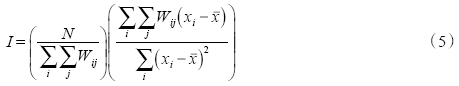 2.2.2 空间自相关分析方法 为考察各区县经济发展水平的空间分布特征,本文用全局莫兰指数(Moran's I)对各区县经济发展水平进行空间自相关分析。全局空间自相关是对属性值在整个区域的空间特征的描述,能够判断出是否存在集聚,并反映整个区域空间集聚程度和类型的变化,其公式为为: