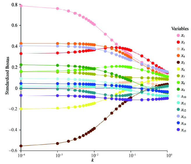 当k=0时就是普通最小二乘估计OLS,对于岭参数k的选择并没有公认的最优标准,主要有方差扩大因子法(VIF),岭迹图法、残差平方和法等。本文采用方差扩大因子(VIF)法选择最佳的k值,当所有岭回归系数的VIF<2时,可以认为对应的k值基本达到最优化。
