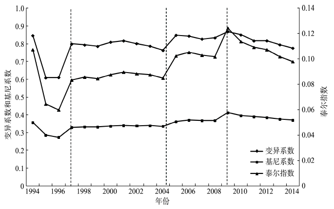 通过对比基尼系数、变异系数和泰尔指数的变化特征,揭示了重庆市1994-2014年间的区县间经济差异的时序变化(图2)。
