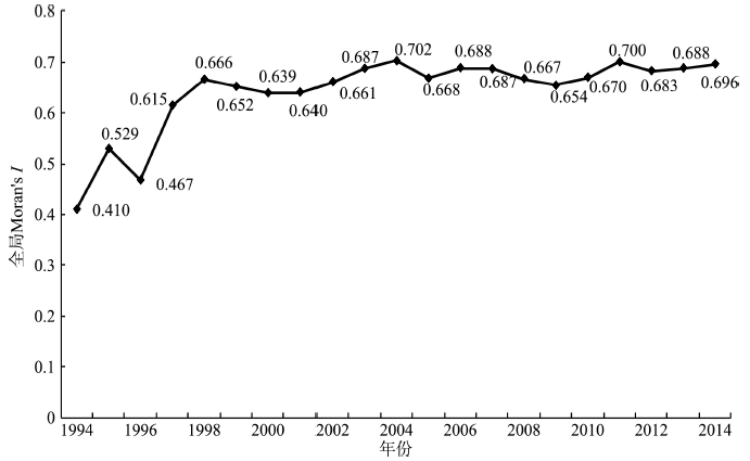 对各区县经济发展水平进行自相关分析,结果如图3所示,可以看出全局莫兰指数的绝对值大致介于0.4~0.7之间,尤其是1998年之后,全局莫兰指数一直介于0.64~0.702水平,整体上表现出非常显著的空间正相关性,即经济发展水平高的区县集聚趋势明显,反之亦然。