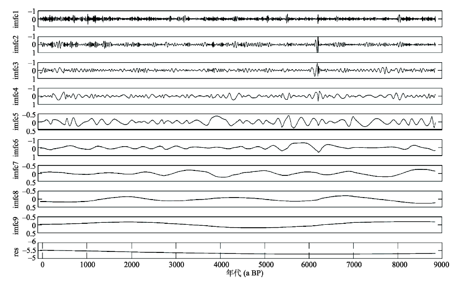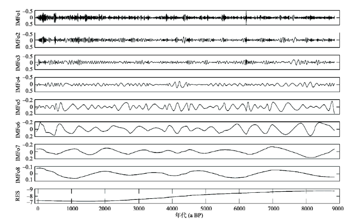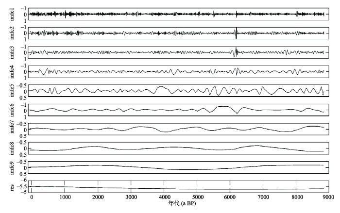 为了揭示气候系统内部变化的精细过程和影响因素,功率谱分析、小波分析、交叉谱分析等方法被引入古气候研究中[24-29]。经验模态分解(Empirical Mode Decomposition, EMD)方法[30]具有数据处理客观、自适性强、数据冗余度小等优点,能够很好地处理非线性、非平稳态数据,明确表达内在尺度下信号波动振幅和周期的物理意义,在古气候变化研究方面的用途广泛。Coughlin等利用EMD方法处理平流层高势位数据,获得5个本征模函数和一个趋势分量,其中第4层分量表示11 a的旋回,与太阳黑子活动周期一致[31]。Liu等基于EMD的方法对全新世石笋氧同位素进行分解,分析了全新世亚洲季风的多尺度特征,通过与太阳活动指标大气