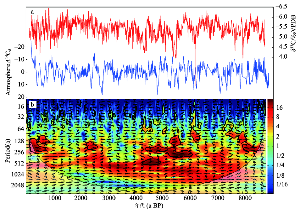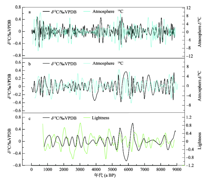 石笋氧同位素变化主要取决于季风降水,而降雨量的变化控制着土壤温、湿度水 平[51]。这些限制性因子影响植被生产率、土壤有机质分解、微生物活动和植物根部呼 吸[52-55],因此影响土壤CO2的产率。较高的土壤CO2分压(pCO2)导致较低的δ13C值[56],并在洞穴沉积物中反映出来。因此,与季风降水相关的土壤演化过程对石笋δ13C信号有显著的影响。石笋氧、碳同位素数据对比显示,石笋δ18C振幅比δ18O大得多。EEMD分析也显示,在同一准周期内,分量imfc的振幅几乎是IMFo的2倍。贵州省董哥洞全新世石笋δ18O记录[9]及其EMD解析结果[33]已揭示了低纬季风受到太阳活动的驱动,那么EEMD分析结果说明洞穴地点的土壤生产率和低纬水汽都响应于上述驱动,但土壤生产率放大了初始输入信号。如果董哥洞全新世石笋分析结果在更大区域上得以证实,石笋δ18C可能更适合于研究太阳活动与气候/生态变化之间的关系,至少在百年尺度上δ13C信号对区域环境变化响应似乎更敏感[16,36]。