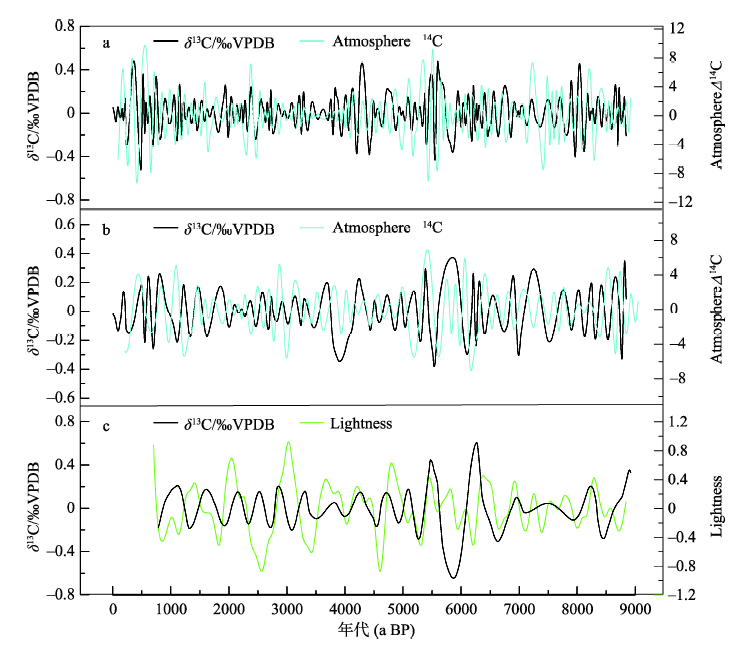 为了进一步判断董哥洞石笋δ13C周期特征与太阳活动的关系,将其与去除趋势的大气