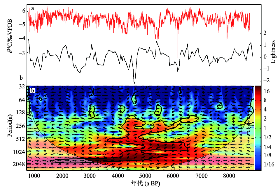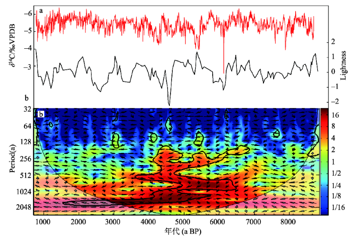 石笋δ13C分解的百年尺度周期的总贡献率为43.29%,其中imfc6的贡献率最大,其对应的526 a周期是δ13C序列变化的主周期。北大西洋NEAP15k岩芯亮度(Lightness)作为北大西洋深层水循环的指标存在显著的550 a周期[46]。董哥洞石笋δ13C记录与NEAP15k记录交叉谱分析显示(图6b),尽管两者从千年到数十年尺度都有一定的相关性,但是很显然最大的相关性出现在550 a周期左右。用同样的方法对北大西洋NEAP15k岩芯亮度进行EEMD分解,并将其准550 a振荡与石笋δ13C序列526 a振荡的进行对比(图5c),对比结果显示两个序列具有一定的相似性。说明在该时间尺度上,北大西洋区域环境演化与低纬植被生产率之间可能存在内在联系。可能的机制是北半球高纬气候通过西风带影响了东亚大陆的温度和干湿度变化,继而影响土壤生产率的变化[47]。