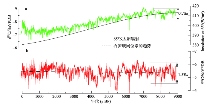 贵州省荔波县董哥洞DA石笋定年精确,平均分辨率达5 a[9],氧、碳同位素时间序列见图1。仔细对比氧碳同位素记录,至少有以下3点认识:① 石笋δ13C序列(图1a)在平均值-5.4‰上下波动,振荡幅度为~1.5‰,大约是δ18O(图1b)的2倍,由此推测石笋δ13C信号对响应区域环境变化可能比δ18O更敏感[16,36,37]。② δ18O序列在轨道尺度上呈现出和65°N太阳辐射一致的变化趋势[9,38],δ13C值相对稳定。③ 石笋δ18O记录的弱季风事件与北大西洋Bond事件一致[3],表明亚洲季风演化与北半球高纬度环境变化遥相关,这些弱季风事件在石笋δ13C序列中也有很好的体现。此外,石笋δ13C序列还存在以1000 a BP、4600 a BP和5400 a BP为中心的持续数百年的偏正,而在石笋δ18O中这些时段却没有明显的变化,说明石笋碳同位素比氧同位素受控因素更为复杂。