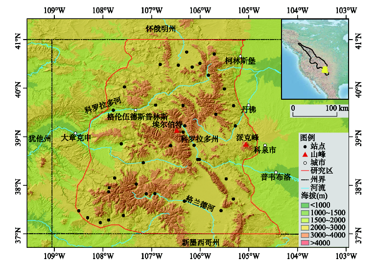 科罗拉多落基山脉位于美国西部,落基山脉的东侧,研究区范围为37°N~41°N、104°30′W~108°40′W,平均海拔2712 m;落基山脉最大高度的中段贯穿其中,许多山峰海拔超过4000 m,其中埃尔伯特峰高达4399 m,是落基山脉的最高峰(图1)。地貌结构复杂,气候类型为北美热带北缘气候。