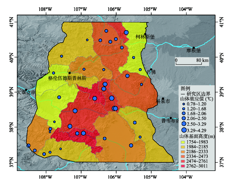 (1)科罗拉多落基山脉山体增温显著,山体内部温度普遍高于山体外部同纬度同高度处的自由大气温度,表明大的山体作为热源对山体本身产生了增温的作用。本文的这一结果与已有的山体效应的研究相吻合,在青藏高原和安第斯山脉的山体效应的研究均表明,山体内部温度高于山体外围的温度[8,9]。此外,科罗拉多落基山脉山体增温受山体基面高度影响较为显著,表现为在山体内部,即山体基面高度比较大的区域,山体增温较为明显。山体增温在科罗拉多落基山脉从中央向外围呈现逐步减小的趋势。
