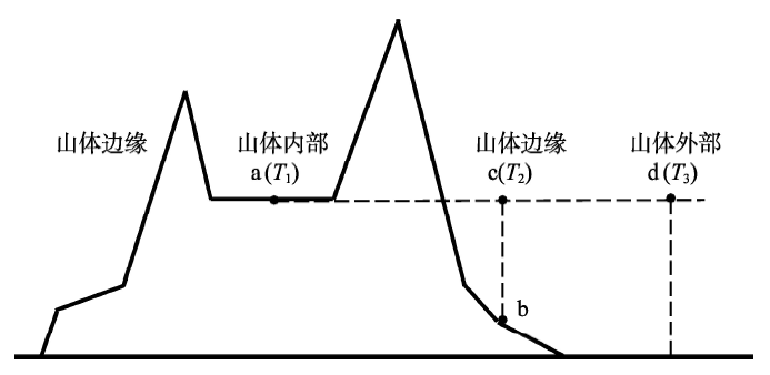 山体效应实质上是山体内部的加热作用,通过山体内部近地面大气温度与山体边缘同高度大气温度之差来表示。由于山区地形复杂,气候变化强烈,边缘地区选点存在诸多不确定性,而且边缘地区跟外部自由大气交流密切,而山区外部自由大气的温度水平变化较小,因此,在实际计算中可以选择外部的大气温度来代替山区边缘的温度。为了保证计算的准确性,大气温度应选择在与边缘地区距离较近、地表未隆起的地区,选择与内部同高度处的大气温度作为山区外部的温度。则山体效应可以表示为山地内部台站温度与外部同纬度同高度处的自由大气温度差[10]。依据张百平等提出的山体效应概念模型(图2)[13],a点位于山体内部,其近地面大气温度为T1,b点位于山体边缘,c点是b点上空与a点处于同一高度的点,c点处的温度即b点上空的自由大气温度,记为T2,d点为山体外部与a点同高度处的点,其所在位置没有山地隆起,处于自由大气中,温度为T3。根据上述对山体效应的分析,山体效应表示为: