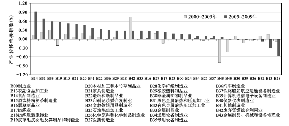 计算河南30个细分行业的产业转移承接指数值,并按照2005~2009年各行业承接指数值由高到低进行排序(图1 )。2000~2005年,河南承接制造业转移的行业数量相对较少;2005~2009年,河南承接制造业行业类型明显增多。2000~2005时段承接指数大于0.1的行业仅有10个,但2005~2009时段迅速增加至21个。