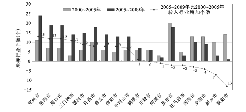 从两个时段不同地市承接的行业数量看(图2 ),有9个地市承接的转移行业数量明显增多,增加10个以上行业数量的地市有4个,分别为郑州、洛阳、周口和三门峡。与此同时,7个地市承接转移行业数量有所减少,分别是濮阳、焦作、南阳、安阳、新乡、驻马店和济源。承接制造业行业重复现象严重,地市间存在恶性竞争,比如2005~2009时段,河南有10个地市承接食品制造业、9个地市承接黑色金属冶炼和压延加工业转移。