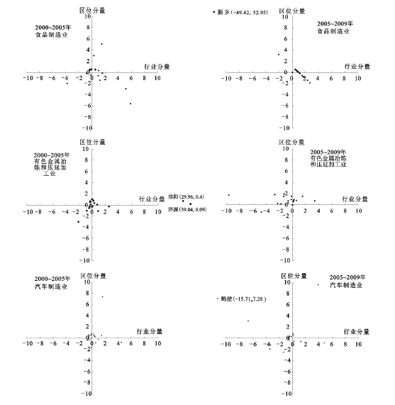 Fig.6 The industry-location distribution of representative industry of cities in Henan in 2000-2005 and 2005-2009
