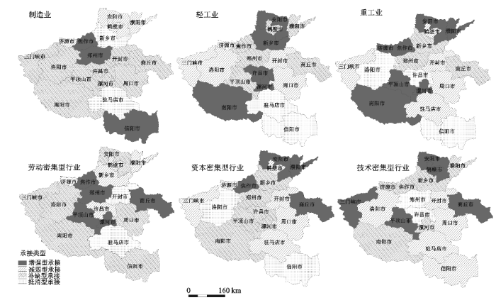 地市也是分析河南区域经济差异的常用尺度。依据前后两个时段各地市承接指数值的高低和增减变化,可将河南18地市承接制造业转移划分为4种类型:增强型(前低后高)、减弱型(前高后低)、补缺型(前无后有)和抵消型(承接指数为负)(图3 )。用ArcGIS10.1对不同行业的承接类型进行唯一值分类,可进一步分析各地市承接类型的行业特点。结果表明:① 从制造业总体看,增强型承接的地市有3个,分别为郑州、焦作和信阳;减弱型的地市有4个,分别为鹤壁、安阳、濮阳和济源;补缺型的地市有9个,分别为洛阳、三门峡、南阳、平顶山、许昌、漯河、开封、周口和商丘;抵消型的有2个,分别为新乡和驻马店;② 从轻工业看,增强型承接的地市有5个,分别是新乡、安阳、许昌、漯河和南阳;减弱型承接的有4个,分别为三门峡、洛阳、开封和周口;补缺型承接的地市有6个,分别为郑州、焦作、平顶山、鹤壁、濮阳和商丘;抵消型承接的有3个,分别是济源、驻马店和信阳;③ 从重工业看,增强型承接的地市有7个,分别是安阳、濮阳、焦作、济源、南阳、平顶山和漯河;减弱型承接的地市有5个,分别是三门峡、开封、周口、驻马店和鹤壁;补缺型承接的地市有3个,分别是郑州、新乡和商丘;抵消型承接有3个,分别是洛阳、许昌和信阳;④ 从劳动密集型行业看,增强型承接的地市有5个,分别是郑州、焦作、平顶山、漯河和商丘;减弱型承接的地市有4个,分别是许昌、新乡、鹤壁和濮阳;补缺型承接的地市有6个,分别是洛阳、三门峡、南阳、安阳、周口和信阳;抵消型承接的地市有3个,分别是济源、开封和驻马店;⑤ 从资本密集型行业看,增强型承接的地市有4个,分别是安阳、濮阳、焦作和商丘;减弱型承接的地市有6个,分别是三门峡、济源、鹤壁、开封、周口和驻马店;补缺型承接的地市有6个,分别是新乡、郑州、平顶山、许昌、漯河和南阳;抵消型承接的地市有2个,分别是洛阳和信阳;⑥ 从技术密集型行业看,增强型承接的地市有5个,分别是安阳、鹤壁、商丘、三门峡和平顶山;减弱型承接的地市有5个,分别是洛阳、开封、周口、驻马店和信阳;补缺型承接的地市有6个,分别是濮阳、新乡、焦作、济源、漯河和南阳;抵消型承接的地市有2个,分别是郑州和许昌。
