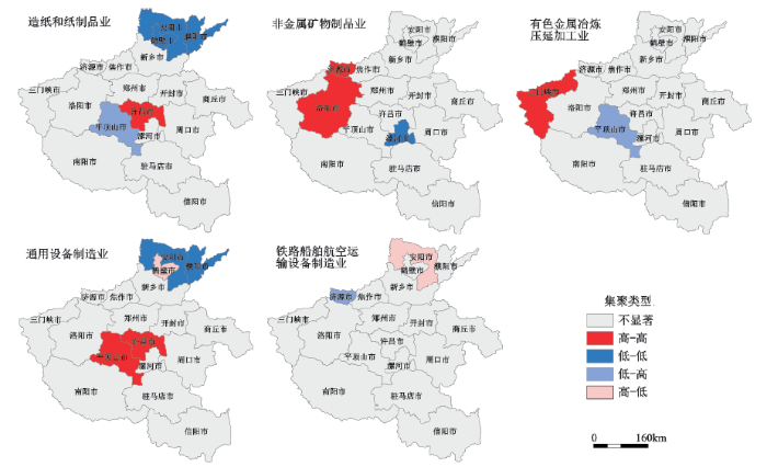 采用全局空间自相关分析方法,剔除数据不完整的行业,在OpenGeoDa里面采用Queen Contiguity方式设定空间权重矩阵测度河南18地市承接制造业分行业转移的空间自相关性,显著性水平可以由标准化Z 值的p -value检验来确定,发现造纸和纸制品、非金属矿物制品业、有色金属冶炼和压延加工业、通用设备制造业以及铁路等运输设备制造业在10%的水平下显著,其他行业结果不显著(表2 )。考虑到河南18个地市研究单元比较少,会对结果造成影响,又加入10个省管县后做同样的分析,分析结果变化不明显。这表明河南承接制造业行业转移过程中,承接地在承接多数行业上受地理邻近性的影响不显著,究其主要原因是河南各地市承接制造业行业重复现象严重,地市间存在恶性竞争,受各地市政府政策导向影响明显。全局空间自相关分析显著的五个制造业行业受地理邻近性影响显著,为考察其在各地区是高高、高低、低高还是低低集聚,对5个行业进一步做局部空间自相关分析(图5 ),其空间权重矩阵的设定和显著性检验方法同全局空间自相关分析一样,结果表明承接造纸和纸制品业转移相对量低的地区集中在安阳、鹤壁和濮阳市,高的地区发生在许昌市,其周围的平顶山市相对较低;承接非金属矿物制品业转移相对量高的地区在洛阳和济源市,低的地区为漯河市;承接有色金属冶炼和压延加工业转移相对量高的地区为三门峡市,本地区低周围高的地区为平顶山市;平顶山和许昌市是承接通用设备制造业转移相对量高的集聚区,承接相对量低的安阳和濮阳市包围着承接量高的鹤壁市;承接铁路船舶航空运输等运输设备制造业转移相对量低的济源市周围承接量高,承接量高的安阳市被低值区域包围。