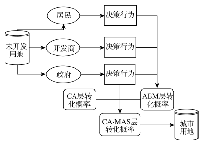 针对CA层的转换规则局限于自身邻域状态的组合上,以及ABM层单纯模拟智能体的决策行为而忽视其选择意愿等问题,本文以地理加权回归为CA层转换规则,从微观角度出发综合考虑地理区位、自然因素以及各智能体对环境变化决策的意愿性和逻辑性,对模型进行改进,使其更为准确地表达各种地理过程和机理,提高模拟结果在地理位置上的可信度和稳定性。因此,本文设计的城市用地扩张模型由以下两大部分组成:元胞自动机模型和多智能体模型(图2)。其中,元胞自动机模型是以各空间数据信息为基础的环境层,采用地理加权回归方法作为转换规则;而多智能体模型选取利用主体、开发主体以及政府主体作为微观智能体,研究讨论其对未开发地块的决策效用,构建ABM层的城市用地转化概率。2个模型最终通过共同的栅格空间实现交互,在汪锐良等(2013)研究方法的基础上加以改进,最终获得未开发地块的CA-ABM的转化概率。即可表示为: