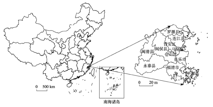 选择福建省福州市作为研究区。福州位于福建东部、闽江下游沿岸,台湾海峡以西。西靠三明市、南平市,南邻莆田市、泉州市,北接宁德市。市域范围包括:台江、仓山、晋安、鼓楼及马尾5个区,及福清、长乐2个县级市,闽侯、连江、罗源、闽清、永泰、平潭6个县的50个乡镇。具体位置如图1。