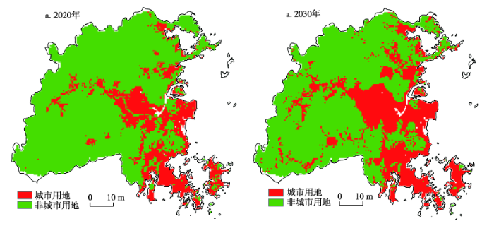 情景是指对一些存在合理或不确定性的事件在未来一段时间内可能呈现的态势的一种假定(王贞超, 2012)。本文根据福州市城市用地扩张的条件和特点,以及未来经济社会发展对城市用地的需求规划,模拟福州市2020年和2030年城市用地的扩张情况(图4)。由图4可知,随着福州市城市用地扩张进程的加快,相对集中的核心城市用地区的空间已不能满足城市用地的发展要求,因此其城市用地开始沿河流和主要交通干线大规模扩张,居民点集聚成城市用地明显。城市用地量从3735 km2增加到4421 km2,年平均水平达到1.84%,相比于2000-2015年增速略有减缓。在原有城市用地连接成片的基础上,城市用地主要往两个方向扩张,一个是东北部,另一个是西南部,空间格局变化明显。模拟结果可为编制土地利用规划和城市的可持续发展提供科学依据。