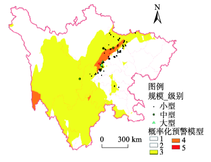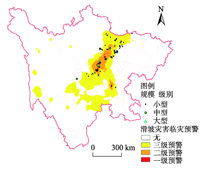 逻辑回归模型三级预警区相对集中;三级预警区面积较小,能包含当日所有滑坡灾害点,同时限制了空报率;二级预警区主要集中在滑坡灾害群发区,包含所有的大型、特大型滑坡灾害,从滑坡灾害强度预测上达到了提高;一级预警区面积很小但集中分布于大型、特大型滑坡灾害附近,对实际预警工作的开展起到了很好地指导作用。