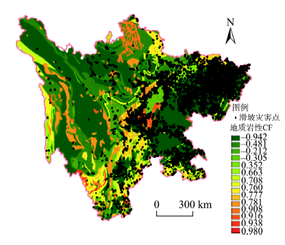Fig. 2 Relationship between lithology CF and distribution of landslide hazard points