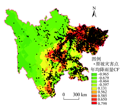 图5 年均降雨量CF与滑坡灾害点分布的关系