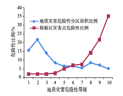 图8 滑坡灾害分区面积及检验区灾害点危险性比例