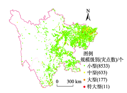 从四川省滑坡灾害空间分布来看,主要有2个显著特征:①条带状分布的特点,这与四川省地震烈度分布相呼应,沿龙门山断裂带、安宁河断裂带和龙泉山脉呈条带状分布的特点尤其明显;②川东北地区滑坡灾害有群发性特征,体现为川东北地区滑坡灾害密度远高于其他地区。如图9所示,滑坡灾害规模级别空间上呈条带状分布和川东北集中性分布的特征明显,特大型滑坡灾害主要分布在龙门山断裂带、零星分布在安宁河断裂带附近,集中分布在川东北巴中、南充、达州3市。