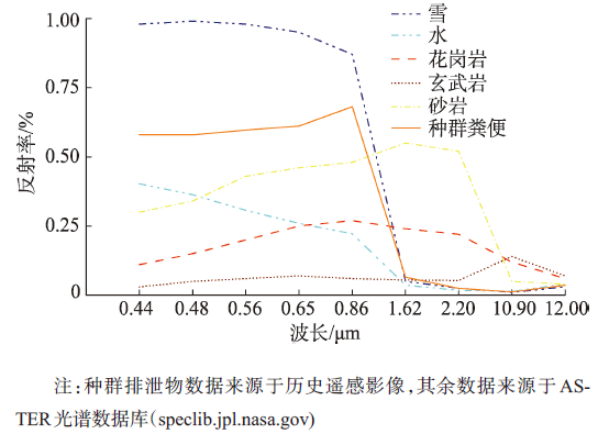 然而,NDII只考虑了岩石和水体的影响,无法与雪区分。雪同样在0.86~1.62 μm处存在“陡坡”,并且反差比种群排泄物更大。显然,使用NDII来提取种群排泄物会受到雪的强烈干扰,无法获取满意的结果。但是,种群排泄物和雪的反射率在蓝、红波段存在差异,种群排泄物在蓝波段处的反射率大于红波段反射率,而雪恰恰相反,因此构建差值指数EI(Extraction Index)可以将雪和种群排泄物区分开。这样降低了雪对种群排泄物提取的干扰,有利于种群排泄物的精确提取。差值指数EI定义如下: